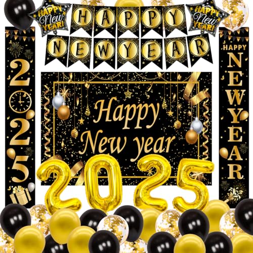 大晦日パーティー用品 2025、ハッピーニューイヤーデコレーション ブラックゴールド ハッピーニューイヤーバナー 背景幕 新年デコレーション 2025 数字 ホイル紙吹雪バルーン ドアバナー NYE デコレーション 2025