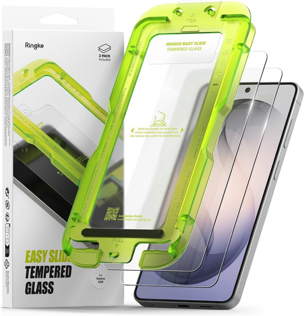 他のフィルムは「貼りやすい」と謳いながら、実際には気泡・ズレ・ホコリのどれかで失敗する可能性を残している。Easy Slideは緑色の専用トレイという「物理的なガイド」で、この3つをすべて潰しにきた。Galaxy S26のフラット画面は曲面ディスプレイと違って端が浮きにくいため、このトレイシステムとの相性が抜群に良い。